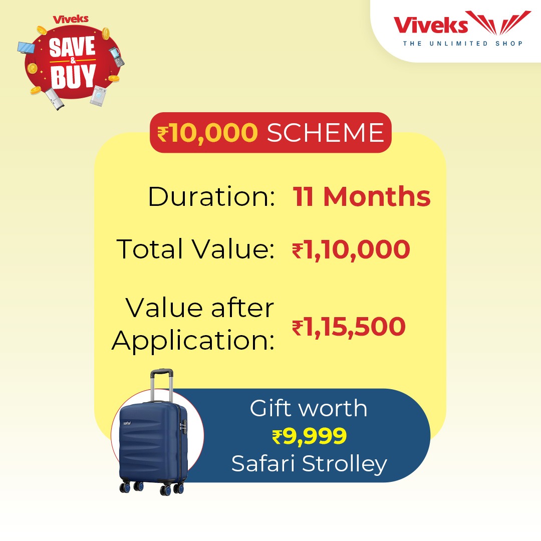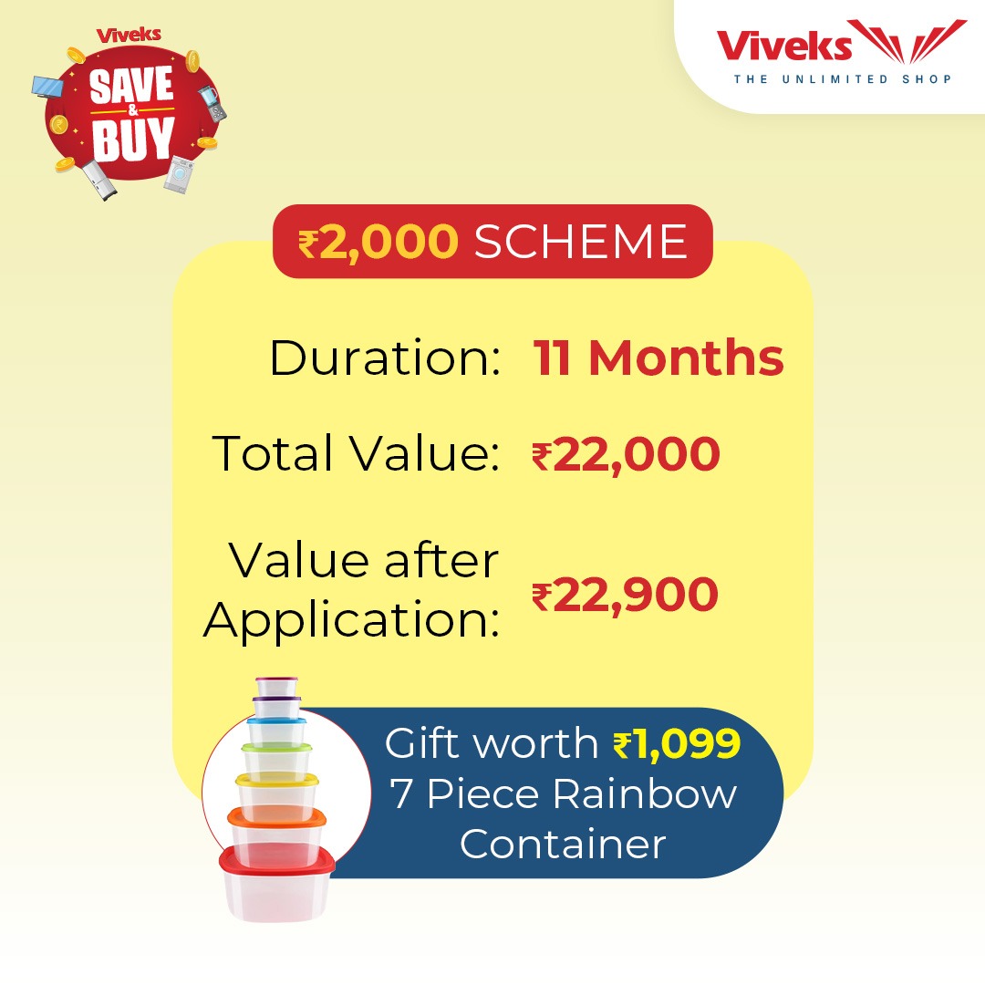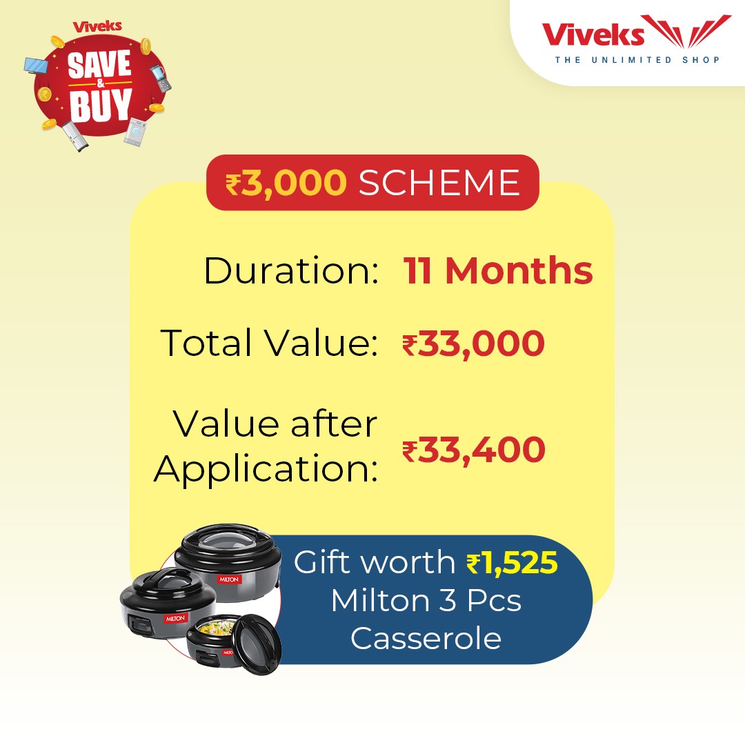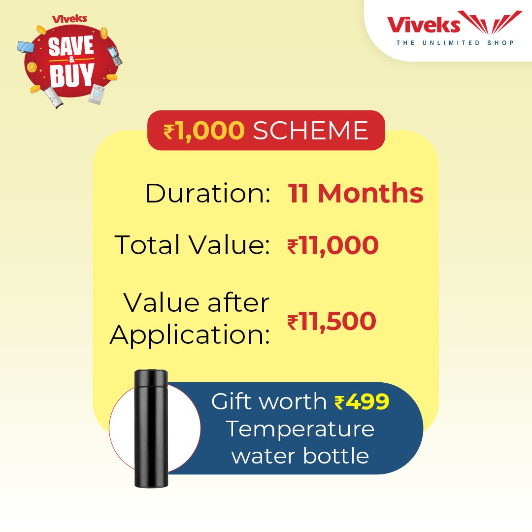 Now, bring home your favourite appliances you've always wanted. Viveks makes it easy to buy! Viveks now brings you a monthly savings option with our unique save & buy-style savings scheme. With an easy process and packed with great benefits, this Save & Buy Scheme for Appliances is here to fulfill your dreams. Now make monthly contributions for 11 months, and buy the product you have always wanted to.